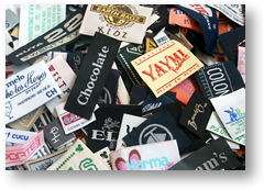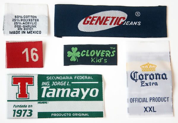 Etiquetas bordadas en tafeta, damasco, sarga, galón, pueden ser en rollo, cortadas, con doblez a la mitad, doblez a las orillas. También fabricamos parches con corte láser y pulseras.