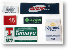 Etiquetas bordadas en tafeta, damasco, sarga, galón, pueden ser en rollo, cortadas, con doblez a la mitad, doblez a las orillas. También fabricamos parches con corte láser y pulseras.